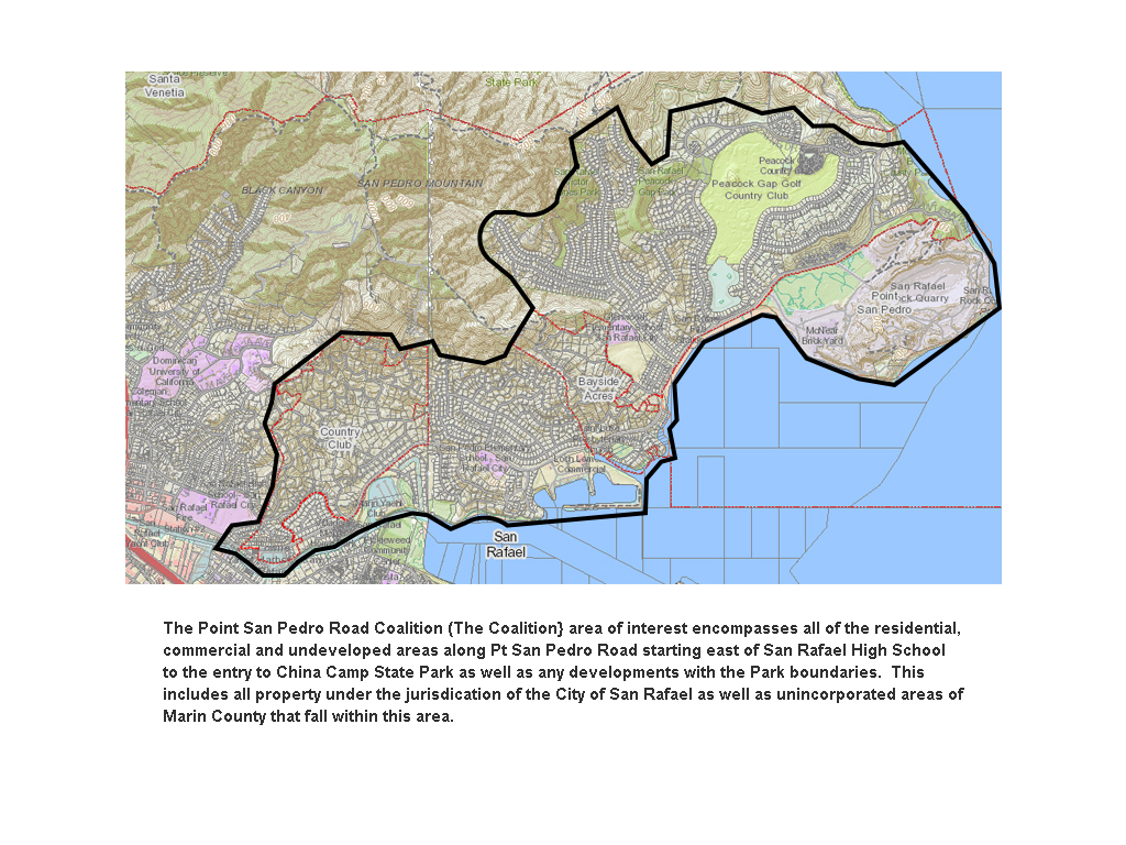 The Coalition’s purpose is to promote the interests of the residents of the Pt. San Pedro Road corridor in east San Rafael, CA in collaboration with residents and neighborhood organizations, to enhance and preserve the beauty and environment of the area, to promote the health and safety of the residents, and to protect the peaceful enjoyment of our residents’ neighborhoods. (Select the image for a larger view of our area of interest.)