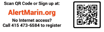 Marin County has implemented an improved countywide emergency alert system called AlertMarin. If you live, work or go to school in Marin County and are 18 and over, you may now register your cell phone or VoIP (voice over internet protocol) phone to receive emergency alerts sent by call, text, email, or smartphone application from the County of Marin. Listed and unlisted/blocked Marin County landline phone numbers are already included in this emergency notification system. You can use the QR code above, call the number indicated, or go to the AlertMarin website.