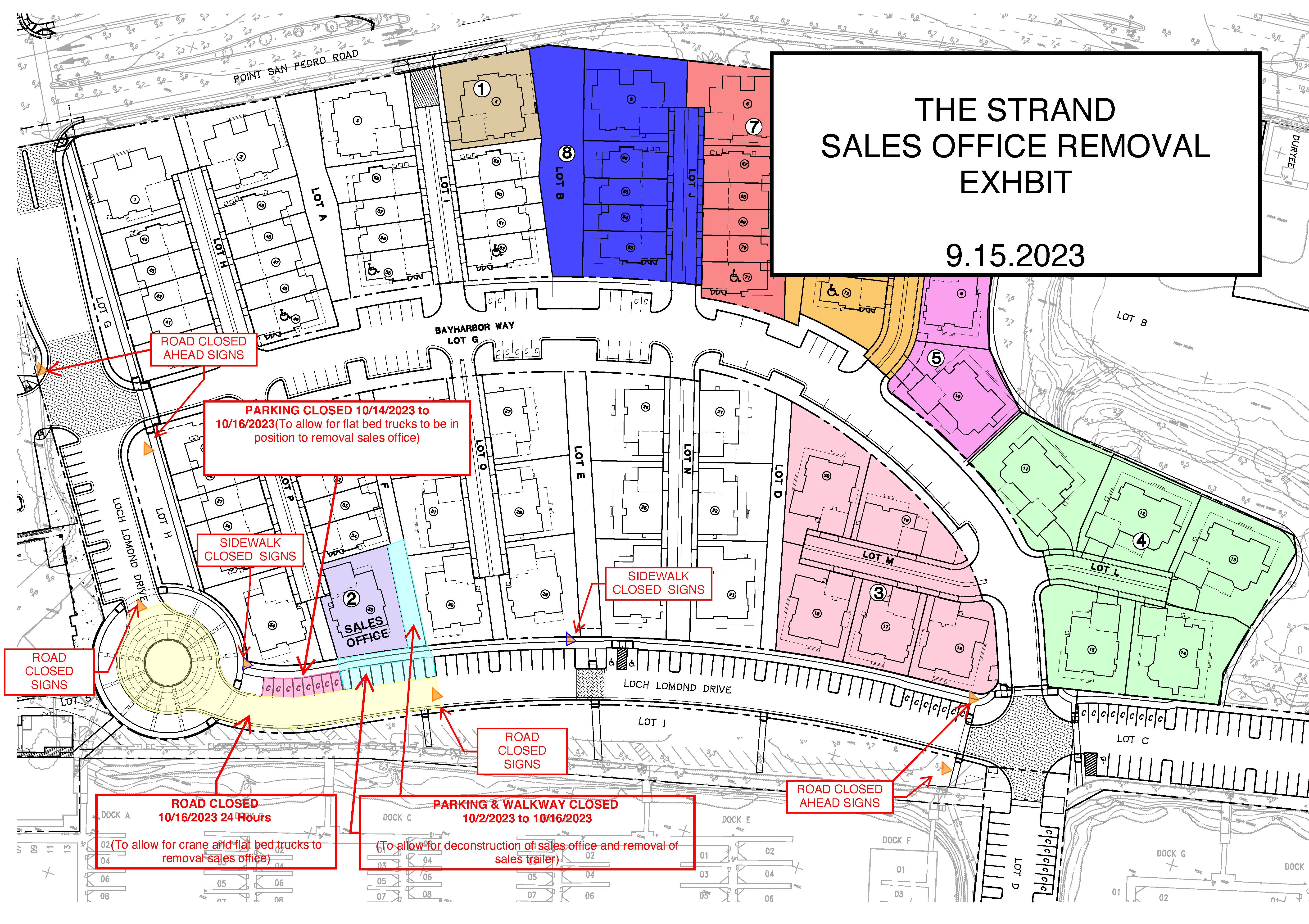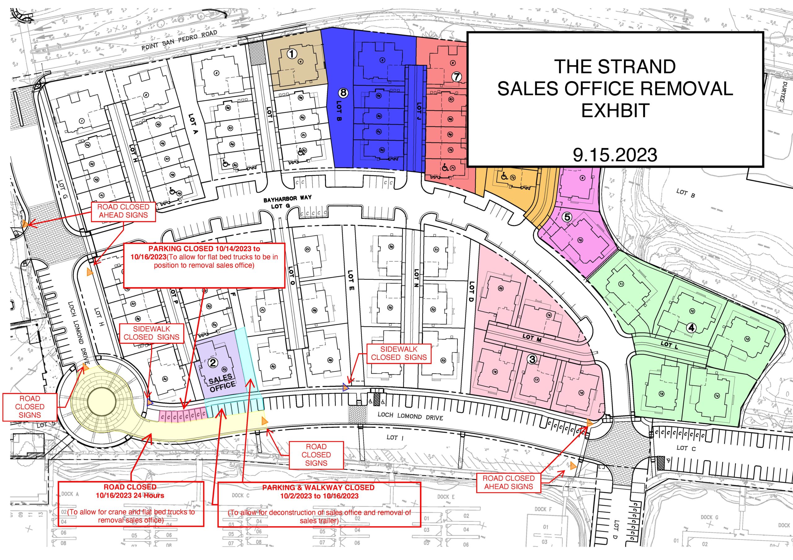 Trumark presented the plans for the removal of the sales office and construction of the single-family home on that parcel (see graphic below – click on it for an enlarged view). That work would begin on or about October 2 and the removal of the Sales Office completed by October 16. This work will entail the temporary closing of some parking spaces adjacent to the Sales Office and the closure for 24 hours (October 16) of a section of Loch Lomond Drive from the roundabout to just past the Sales Office necessitating using Bayharbor Way as an alternative route. Actual construction of the residence at that parcel will likely require the closure of the adjacent sidewalk and parking spots during construction.