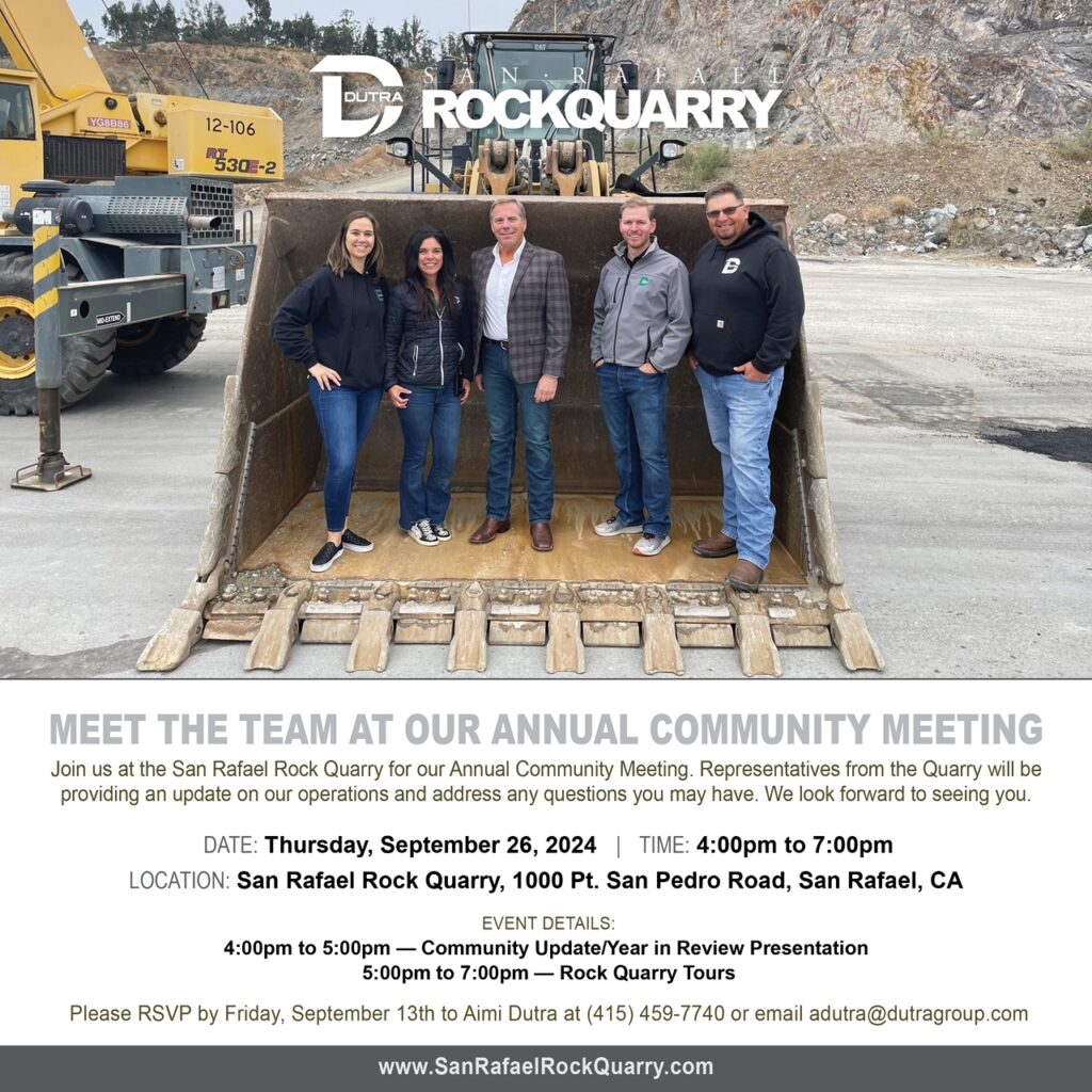 Below is a flyer from the Dutra Rock Quarry announcing their Annual Community Meeting on Thursday, September 26 from 4pm to 7pm. Please RSVP to Aimi Dutra at adutra@dutragroup.com or call (415) 459-7740.