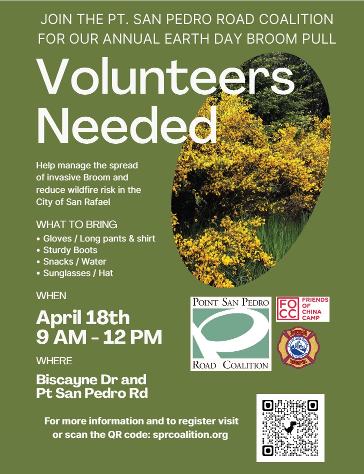This year’s event will be in partnership with Friends of China Camp (FOCC) and the San Rafael Fire Dept. Meet us and sign in at the table on Biscayne Drive near the intersection with Point San Pedro Road.