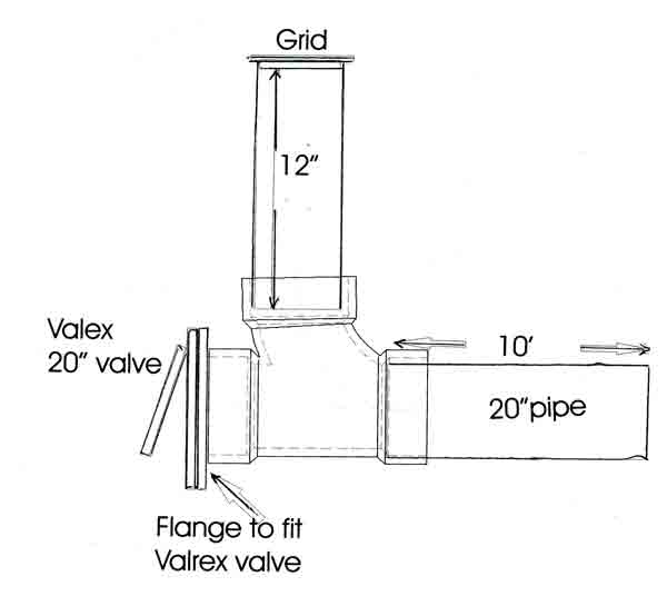 The proposed new pipe (10 feet of 20″ pipe), flap gate (called a “valve” in the drawing) and air gap (12″ vertical pipe and “grid”) are shown in the drawing below.